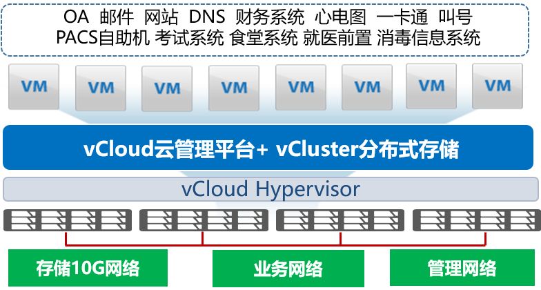 瑞馳根據(jù)醫(yī)院的業(yè)務(wù)需求,將醫(yī)療信息化軟件平臺部署在瑞馳vCloud超融合架構(gòu)上,以虛擬機的形式運行,能極大的提升硬件利用率、降低運維成本。同時,瑞馳超融合架構(gòu)支持萬兆互聯(lián)、副本機制、高IOPS和吞吐量等,在安全、穩(wěn)定的基礎(chǔ)上保障效率優(yōu)先。 此次建設(shè)的超融合平臺可以支撐醫(yī)院所有輔助管理系統(tǒng)的運行,后續(xù)根據(jù)業(yè)務(wù)需要,也可以隨時對超融合系統(tǒng)進行擴容,擴容后將支持更多業(yè)務(wù)應(yīng)用。