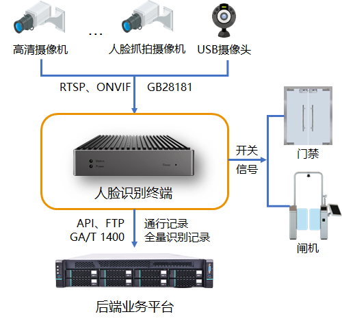 采用人臉識別和訪客機的方式,通過門口攝像機采集的人臉信息,跟系統(tǒng)中的人臉庫做比對,判斷來訪者是否有進(jìn)出權(quán)限,并結(jié)合傳統(tǒng)的門禁識別方式,控制門鎖的開關(guān),從而方便人員通行,提高服務(wù)質(zhì)量。業(yè)務(wù)需要的情況下,可以在人臉識別的同時,記錄考勤信息,生成考勤報表。