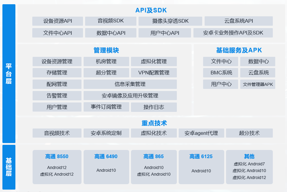 瑞馳搭載高通8550、6490、865、6125等板卡打造的新型算力基礎(chǔ)平臺,具備虛擬化開發(fā)能力、安卓系統(tǒng)軟件能力、音視頻開發(fā)能力、存儲能力和基于ARM架構(gòu)的計算能力。