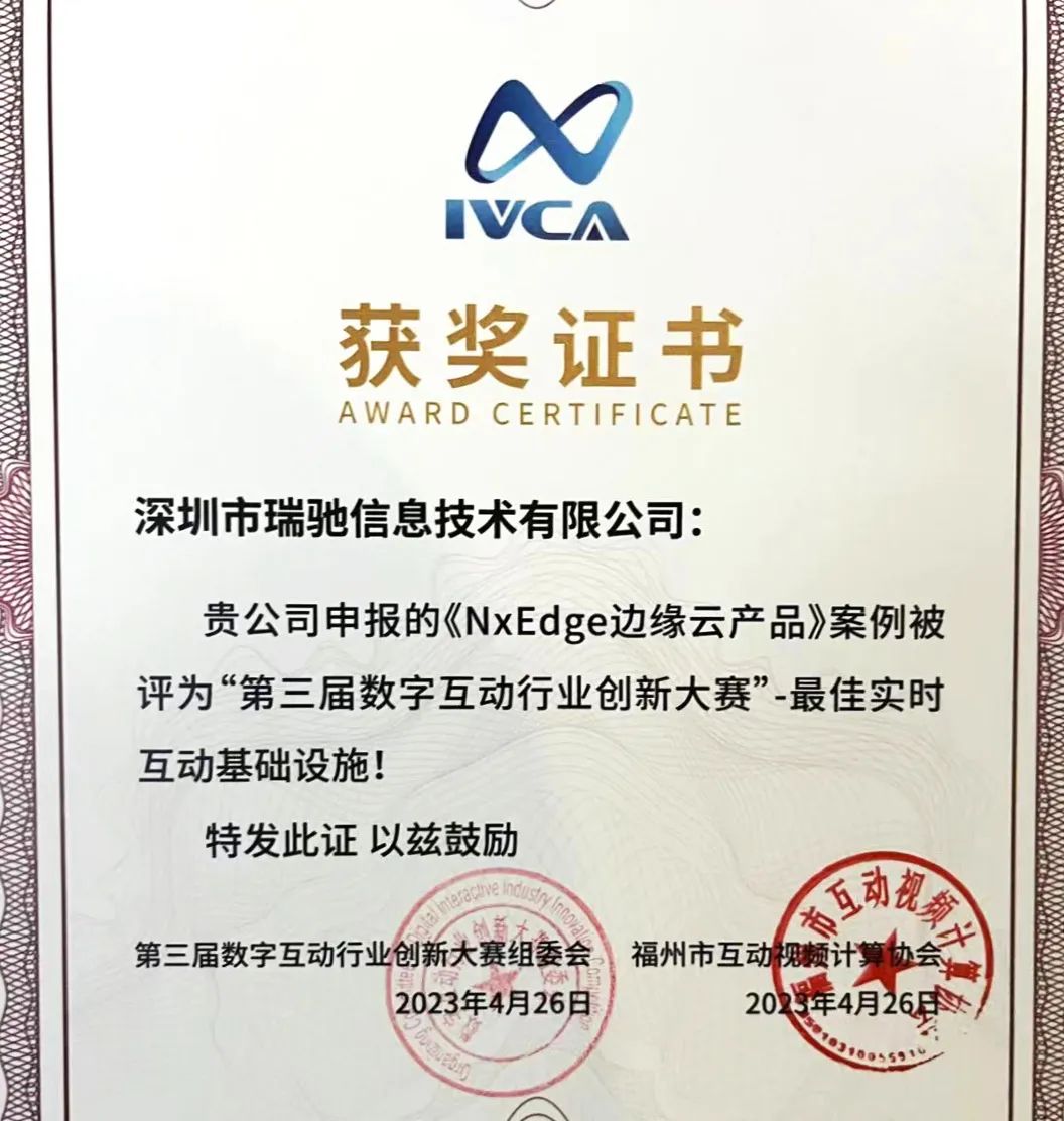 瑞馳榮獲數(shù)字互動行業(yè)創(chuàng)新大賽登云獎 “最佳實時互動基礎(chǔ)設(shè)施”獎。