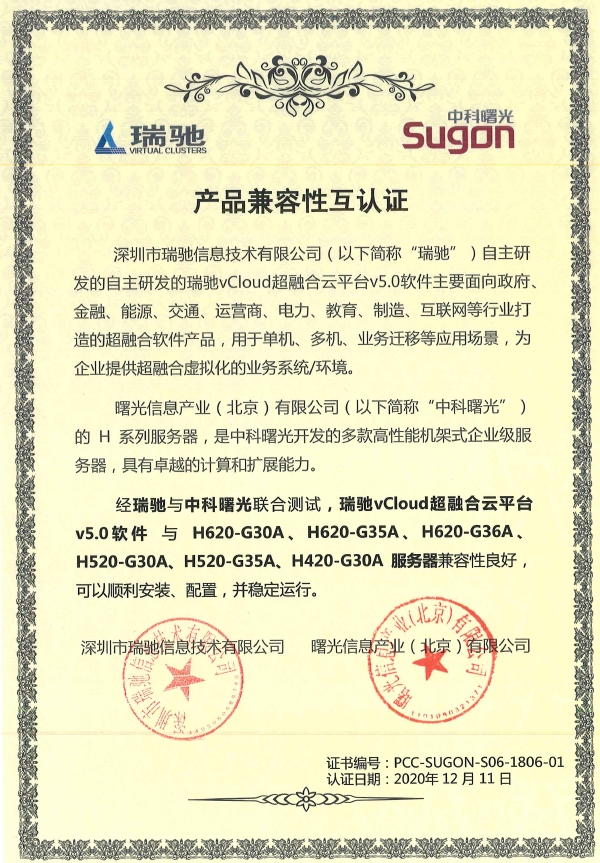近日,瑞馳與中科曙光完成產(chǎn)品兼容性互認證。經(jīng)測試,瑞馳vCloud超融合云平臺V5.0軟件與中科曙光H620-G30A、H620-G35A、H620-G36A、H50-G30A、H520-G35A、H420-G30A服務器兼容性良好。瑞馳平臺可以在曙光服務器上順利安裝、配置,并運行良好。在瑞馳平臺+曙光服務器構建的虛擬化、私有云、混合云環(huán)境中,多種應用可長時間穩(wěn)定運行,瑞馳平臺在物理資源管理,系統(tǒng)彈性擴展,高可用等方面表現(xiàn)出色。
