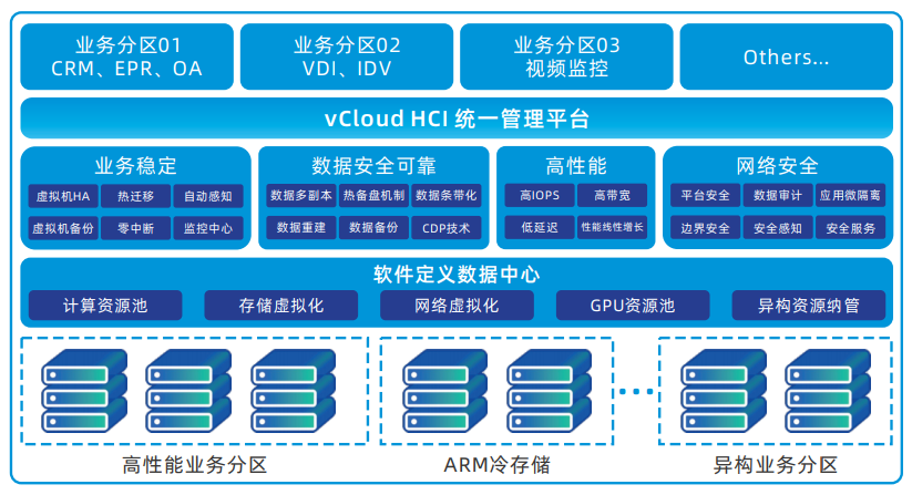 瑞馳自主研發(fā)的vCloud超融合云平臺產(chǎn)品,面向用戶提供良好的用戶界面,可橫向擴展的計算、存儲、網(wǎng)絡基礎設施統(tǒng)一架構,不僅可以大幅降低用戶IT系統(tǒng)復雜性及運維難度,同時其全分布式架構設計、后端數(shù)據(jù)冷熱自動分層、全場景AI特性支持以及高速硬件優(yōu)化適配等特點,更能為高性能計算、企業(yè)OA、大規(guī)模視頻管理后臺、智能營業(yè)廳等應用場景提供持續(xù)、高效、穩(wěn)定的基礎設施支撐,目前已在測繪、數(shù)字政府、平安城市、金融等領域得到廣泛的應用,受到客戶一致好評。