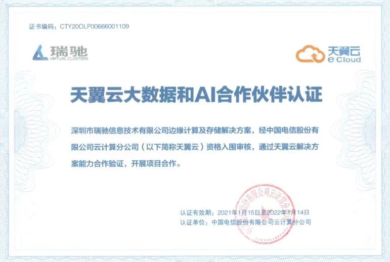 近日,深圳市瑞馳信息技術有限公司榮獲天翼云合作伙伴認證,瑞馳邊緣計算及存儲解決方案,通過天翼云解決方案能力合作驗證,成為天翼云大數(shù)據(jù)和AI重要合作伙伴。