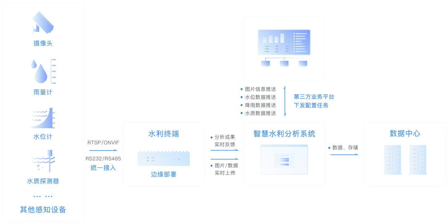 智慧水利邊緣終端設備將前端攝像頭(利舊/新建)和水位計,雨量計、水質(zhì)探測器等物聯(lián)感知設備統(tǒng)一接入到邊緣終端設備上面,對水域治理中的水尺識別,管道排水、河道漂浮物、游泳檢測、釣魚檢測、區(qū)域入侵、降雨量,水位信息進行統(tǒng)一分析和檢測,并采用標準API接口對接形式,將視頻監(jiān)控分析的結(jié)果推送至相應的業(yè)務應用平臺或服務器。